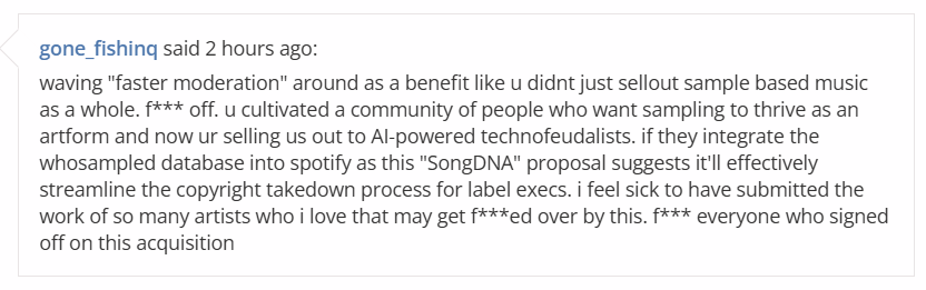 Une partie de la communauté hip hop est déjà peu encline à partager les samples découverts. On part de snitch c’est à dire des balances. Je reste partager sur cet aspect personnellement car je pense que des sites comme WhoSampled permettent aussi de faire découvrir de la musique et apporter de la curiosité. Reste qu’on peut désormais complètement leur donner raison: en rejoignant Spotify, expliciter des samples sera un truc de balance. Je pense que la communauté du site réagira d’ailleurs comme moi en grande partie. Il y a quelque chose de très sale de vendre à un bon prix un travail qui a été réalisée collectivement et gratuitement. Bien sûr WhoSampled offre une infrastructure qu’il entretient mais la valeur ajoutée du site tient dans ces contributions de passionnés.